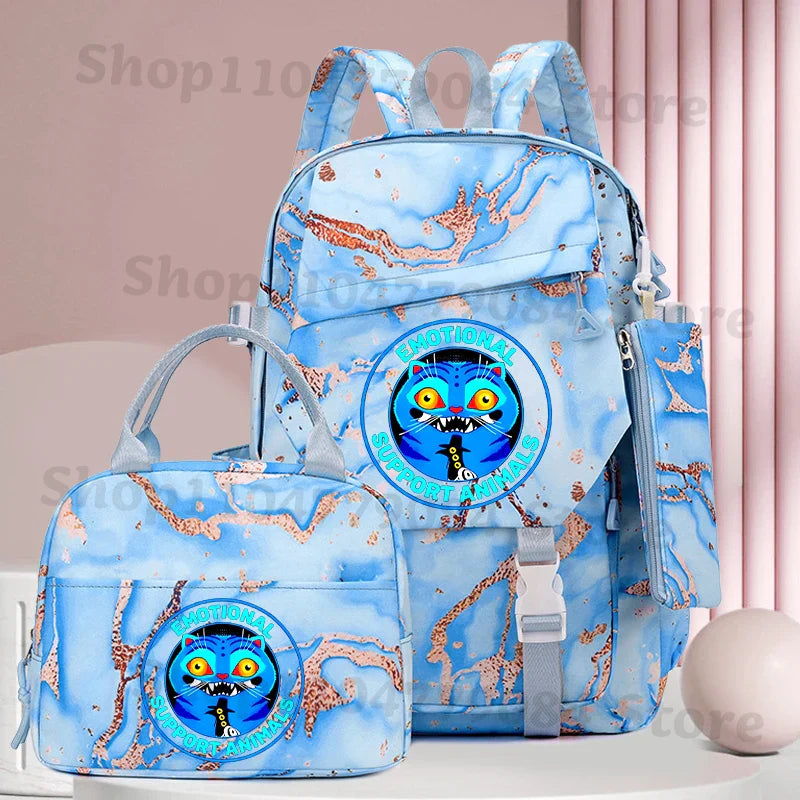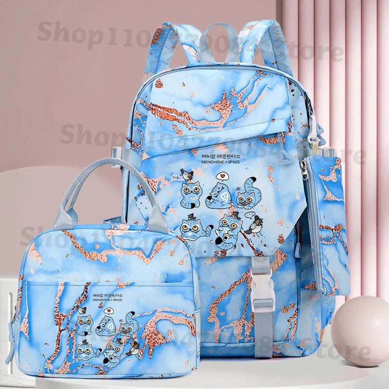 - Includes a spacious schoolbag, insulated lunch bag, and a handy pen case